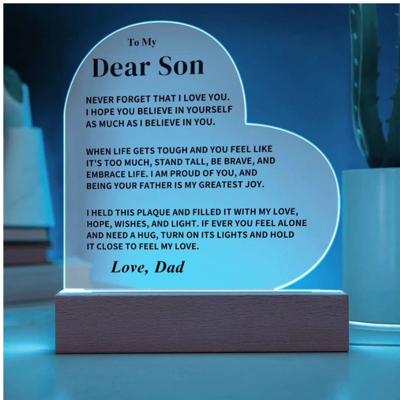 This beautiful sign is handcrafted using premium acrylic and a vibrantly printed design. A perfect display in a room. This would make an ideal gift for your son on special occasions like Christmas, birthdays, or any event where you want to express your love and appreciation in an unforgettable way.
