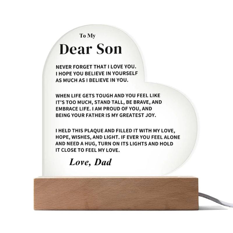 - 1 x To My Son - LED Heart Acrylic Plaque With Wooden Base